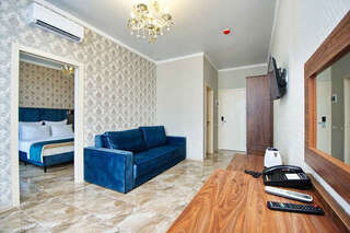 В номере: две двуспальные кровати, кресло-кровать, прикроватные тумбочки, туалетный столик, ЖК-телевизор, кондиционер, шкаф-купе с зеркалом, холодильник, чайник, кондиционер.
